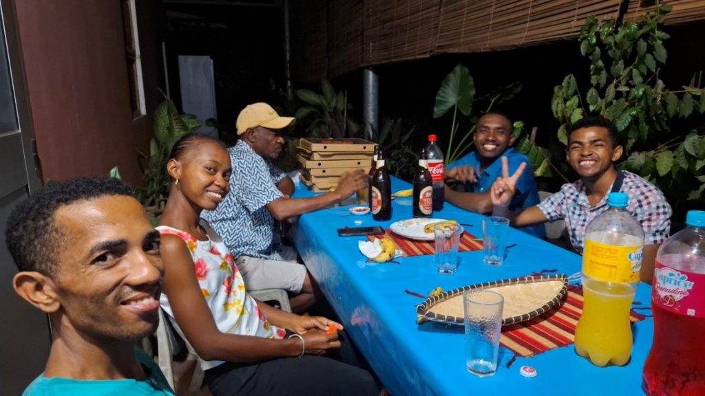 -Il m’est toujours agréable de retrouver la Clinique St Damien et ceux qui y travaillent en permanence. L’accueil est simple et fraternel. La semaine s’est terminée par un repas commun pris sur la terrasse de l’hébergement avec ceux qui nous ont aidés, Joséa et moi. Pizzas, bière et chants malgaches…