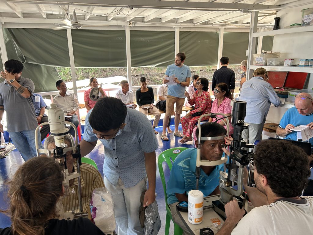 Je ne me souviens pas d’avoir vu autant de cataractes bilatérales à CLD de toutes mes missions, on a vu peu de jeunes ; 2 glaucomes sévères et aussi en quasi cécité un GNV, 3 RDNP stade sévère et 2 dmla atrophique.